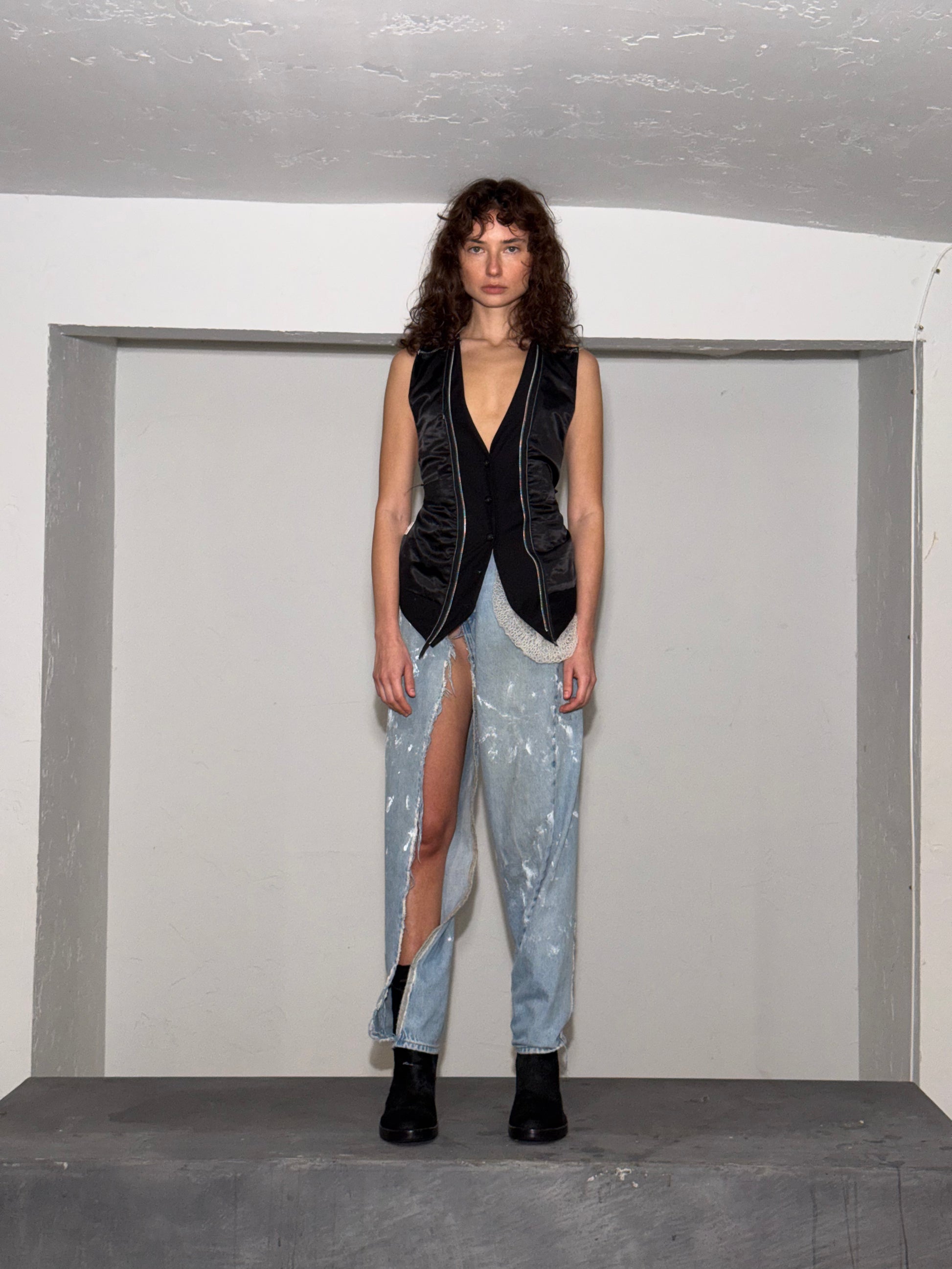 This jeans came from a former lover, back when the relationship still held together. Later, both the denim and the bond tore in the same places. They’ve been worn through cities and states: Los Angeles, New York, Atlanta and countless American roads in between. During the preparation of a Pussy Riot art exhibition, these jeans were there. Paint from the artworks still stains the fabric. Not as decoration, but as evidence. Upcycled, reworked, and carried forward by hand. Vintage denim with a documented past.